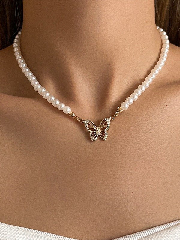 Collar de perlas de imitación de mariposa de diamantes de imitación