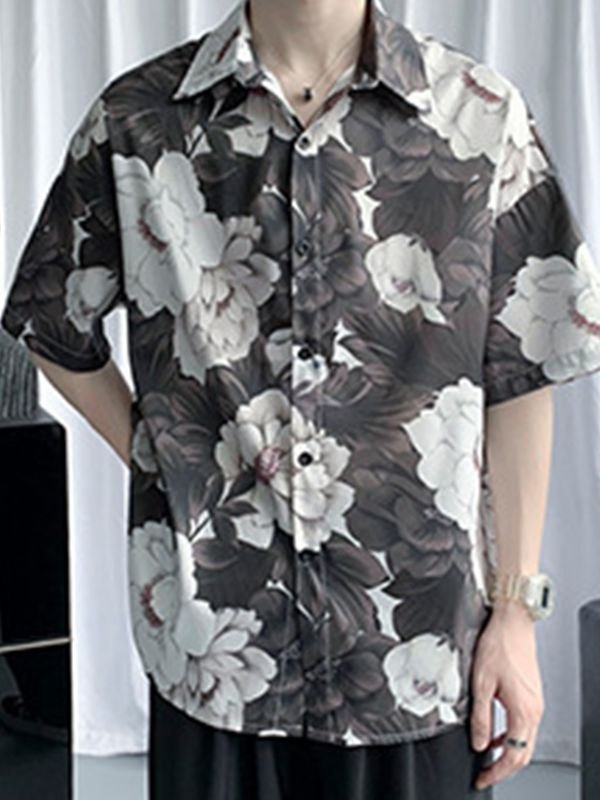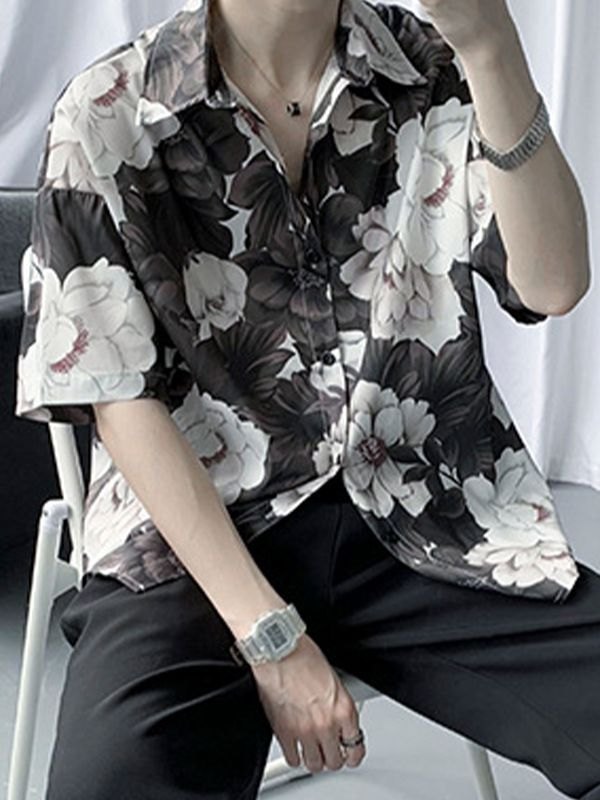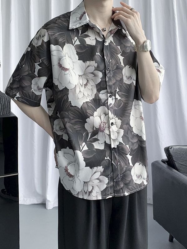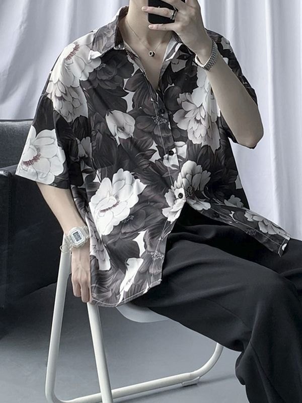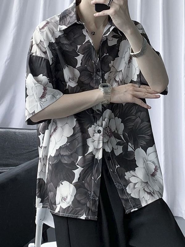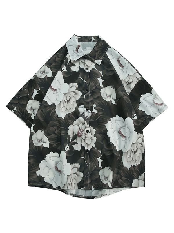 Estilo: Informal/Callejero/Vintage Color: Negro Contenido de la tela: Poliéster Tipo de calce: Corte regular Escote: Cuello vuelto Longitud de la manga: Manga corta Diseño: Presenta un estampado floral en toda la prenda, esta camisa tiene un calce favorecedor y se abrocha con un botón en la parte delantera.